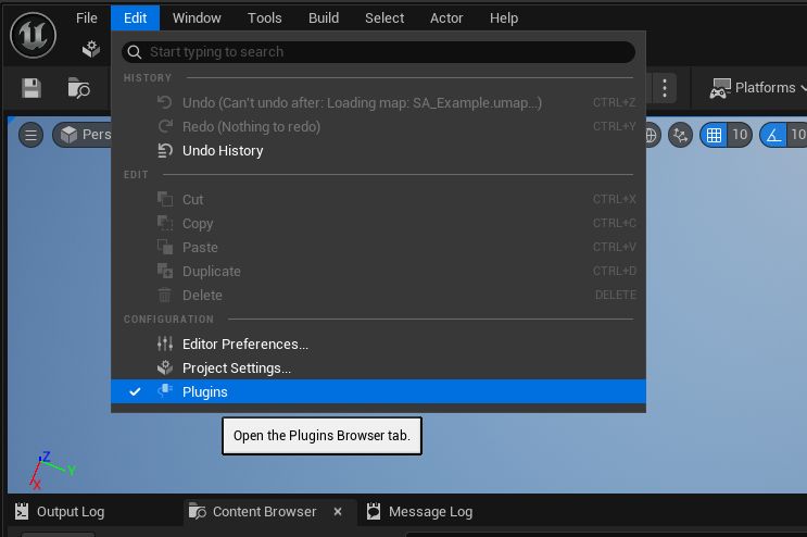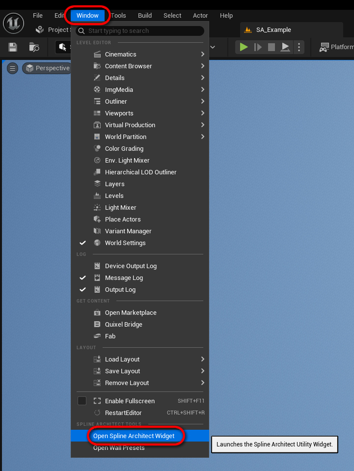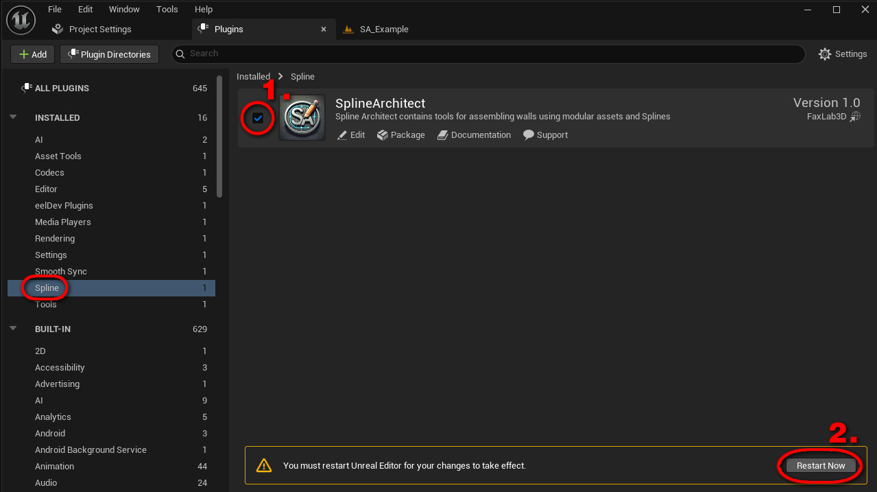 Open your Unreal Engine project, go to Edit > Plugins, find Spline Architect, check the box to enable it, and restart the editor.