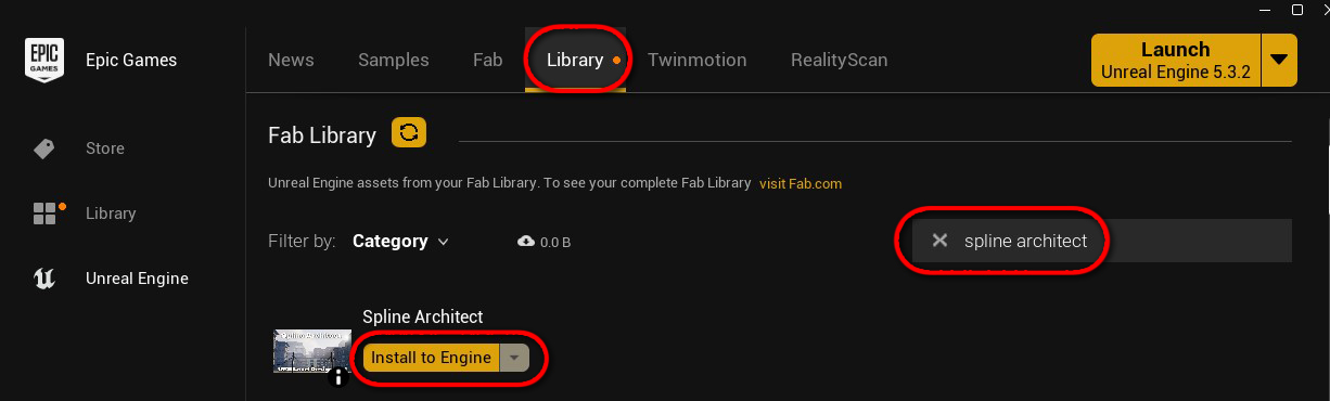 - Locate Spline Architect in the FAB Library section and click Install to Engine
