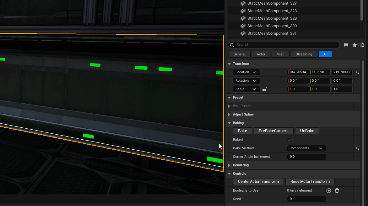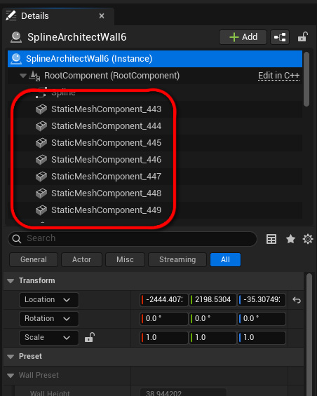 Once SplineArchitectWall is baked, all the “one-time” meshes are converted into regular StaticMesh components, and the actor no longer executes any logic when loading. |