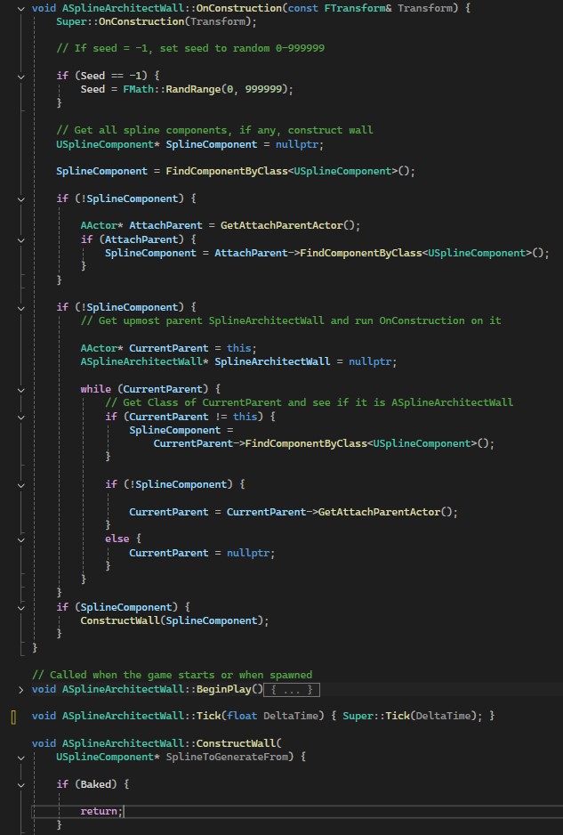 Generation happens inside the SplineArchitectWall actor, in the OnConstruct() function. The generation runs every time it is loaded, unless the structure has been baked. |