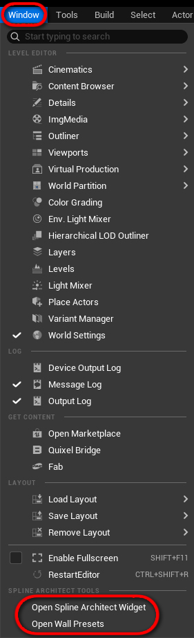 Widgets can be accessed via Window > Open Spline Architect Widget/Wall Presets