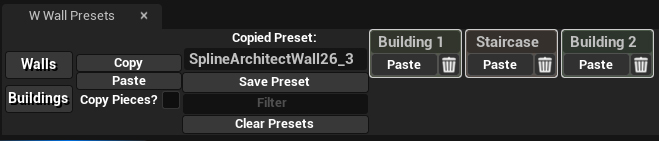 Copy | Copies the WallPreset struct from the selected SplineArchitectWall and saves it as a SaveGame file SplineArchitectWallPresets.sav in the "YourProject\Saved\SaveGames" folder. |