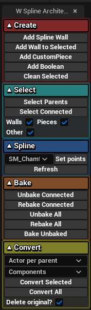 Convert Selected | Converts selected SplineArchitectWall actors into regular actors with components. Useful when the project doesn’t have the SplineArchitect plugin. |