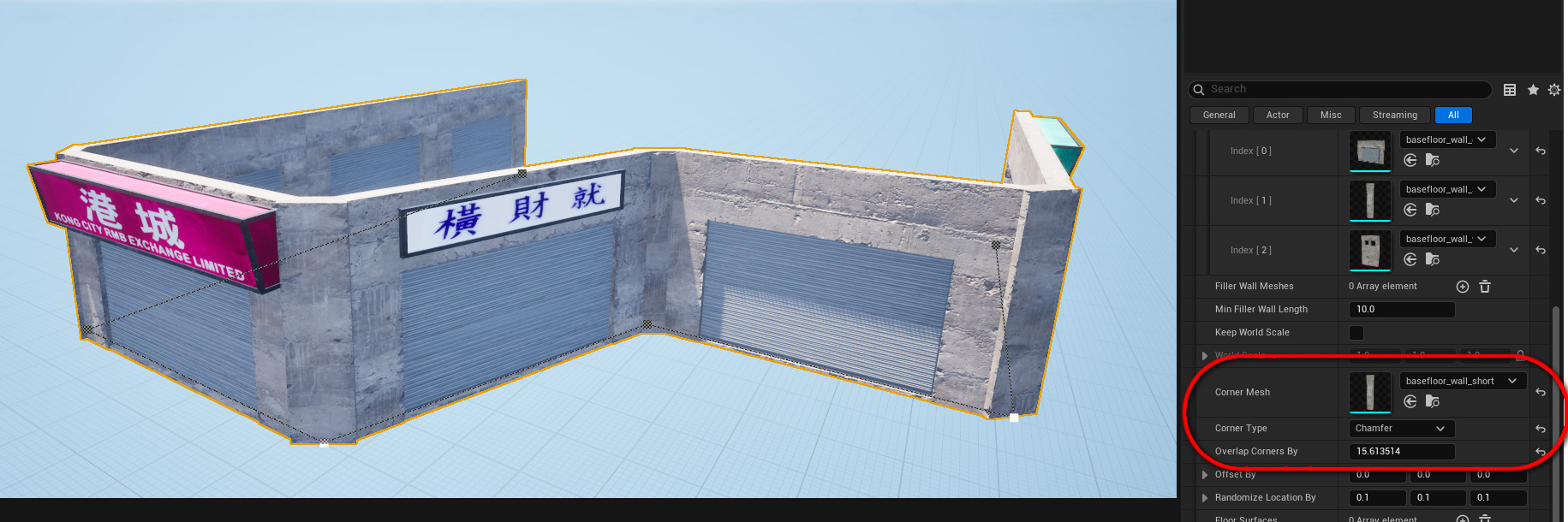 . This will hide transitions between wall meshes. While it’s not exactly the same as using corners, the advantage is that no dynamic generation is required.