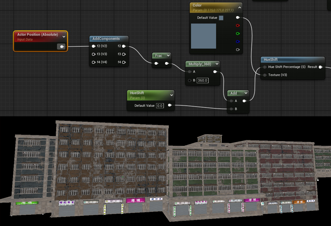 - Actor Position can be used as a seed to shift hue or other color variations per-building.