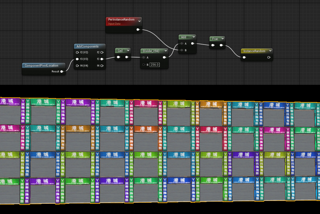 Another way to break up repetition is to add variation inside the material itself, using world-space position or per-instance random values as a seed.